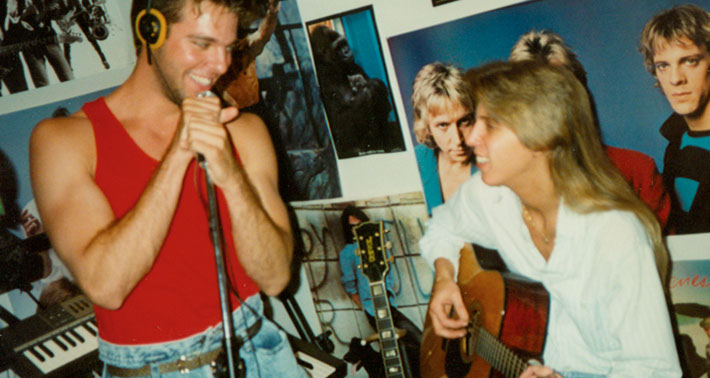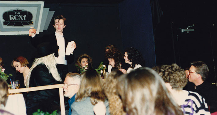 The premiere at The Roxy, December 1989. I was making a limp-wristed toast to the cast, who were seated onstage.