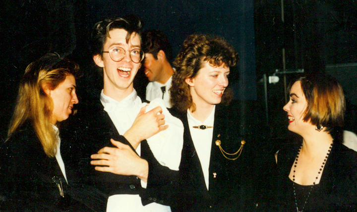 Karen Terrier, Christine Bouchard and Shannon Lastowski (Craig Goding in the back) in their 80s finery at the premiere at The Roxy, December 1989.