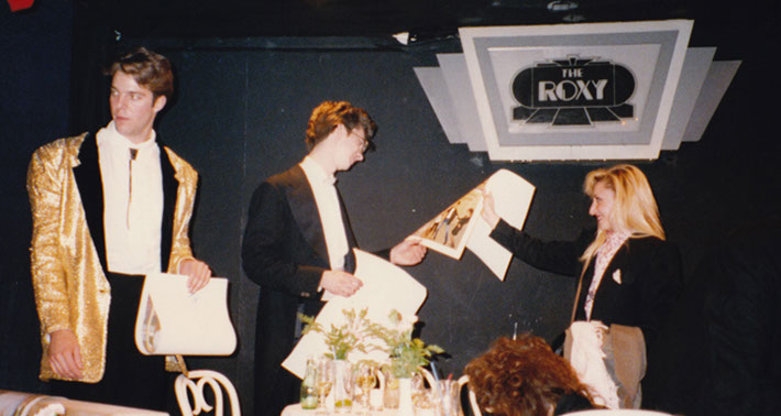 The premiere at The Roxy, December 1989. I was making a limp-wristed toast to the cast, who were seated onstage.